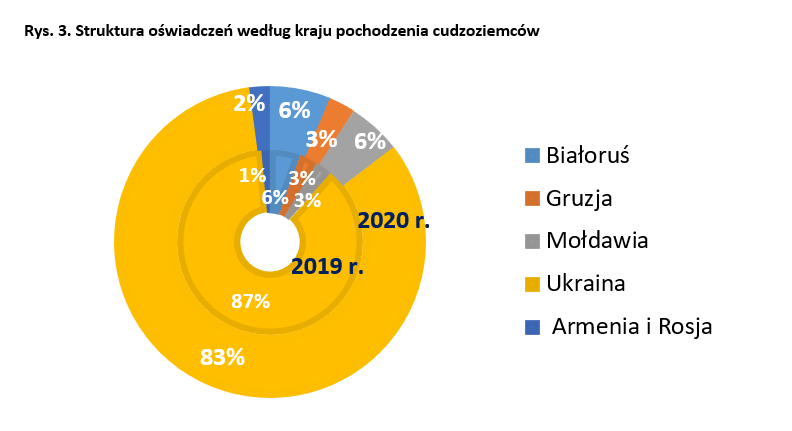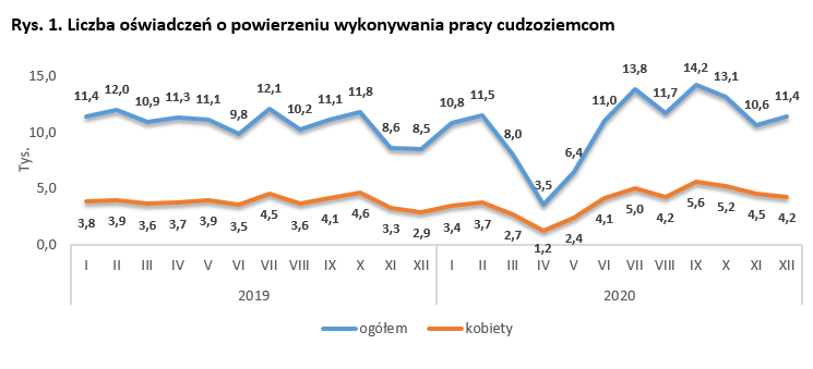 Od stycznia do grudnia 2020 roku wpisano do ewidencji 126,0 tys. oświadczeń o zamiarze zatrudnienia cudzoziemców (w analogicznym okresie rok wcześniej było ich 128,8 tys.). Średnio miesięcznie było to 10,5 tys. takich dokumentów, jednak liczba ich różniła się w kolejnych miesiącach. Pierwsza fala pandemii, „zamrożenie” gospodarki i zamknięcie granic Polski spowodowało, że pracodawcy zostali odcięci od pracowników zza granicy, dlatego wtedy odnotowano najmniej oświadczeń.