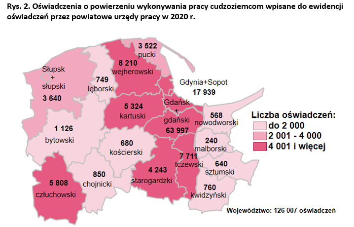 Obcokrajowcy pracujący na Pomorzu najczęściej wybierają Trójmiasto, głównie Gdańsk. W tym mieście i całym powiecie gdańskim odnotowano ponad połowę wszystkich oświadczeń (64,0 tys.) zarejestrowanych w ciągu 2020 roku. Zdecydowanie mniejszy popyt zgłoszono w Gdyni i Sopocie. Tam odnotowano 14 proc. wszystkich oświadczeń, czyli 17,9 tys. Najmniejsze zainteresowanie zatrudnieniem obcokrajowców w ciągu roku wykazywały powiaty usytuowane na wschodniej granicy województwa, jak powiat malborski (240 oświadczeń), nowodworski (568 oświadczeń) i sztumski (640 oświadczeń).