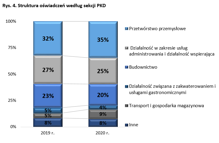 W 2020 roku, podobnie jak w 2019, najwięcej, bo ponad 1/3 cudzoziemców (43,5 tys. osób), znalazła zatrudnienie w sekcji przetwórstwo przemysłowe. Co czwarty cudzoziemiec zatrudniany był w sekcji działalność w zakresie usług administrowania i działalność wspierająca, natomiast co piąty w budownictwie. Najmniej cudzoziemców, bo zaledwie 4 proc. (czyli 4,7 tys. osób) podjęło zatrudnienie w sekcji działalność związana z zakwaterowaniem i usługami gastronomicznymi oraz w transporcie i gospodarce magazynowej, gdzie stanowili 9 proc. wszystkich oświadczeń (11,3 tys. osób).