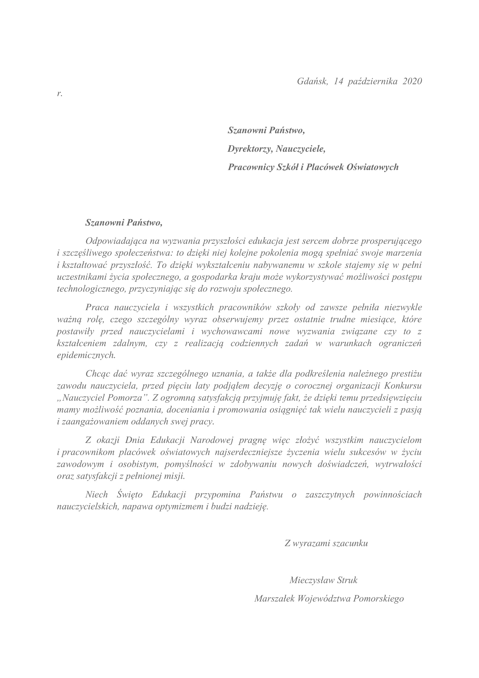 Specjalny list z życzeniami z okazji Dnia Edukacji Narodowej do nauczycieli, dyrektorów i pracowników placówek oświatowych wysłał marszałek województwa pomorskiego. Mieczysław Struk podkreśli ważną rolę nauczania w budowaniu świadomego i nowoczesnego społeczeństwa, a także zauważył wyzwania stojące przed oświatą w czasach epidemii. W liście marszałka czytamy: „Praca nauczyciela i wszystkich pracowników szkoły od zawsze pełniła niezwykle ważną rolę, czego szczególny wyraz obserwujemy przez ostatnie trudne miesiące, które postawiły przed nauczycielami i wychowawcami nowe wyzwania związane czy to z kształceniem zdalnym, czy z realizacją codziennych zadań w warunkach ograniczeń epidemicznych”.