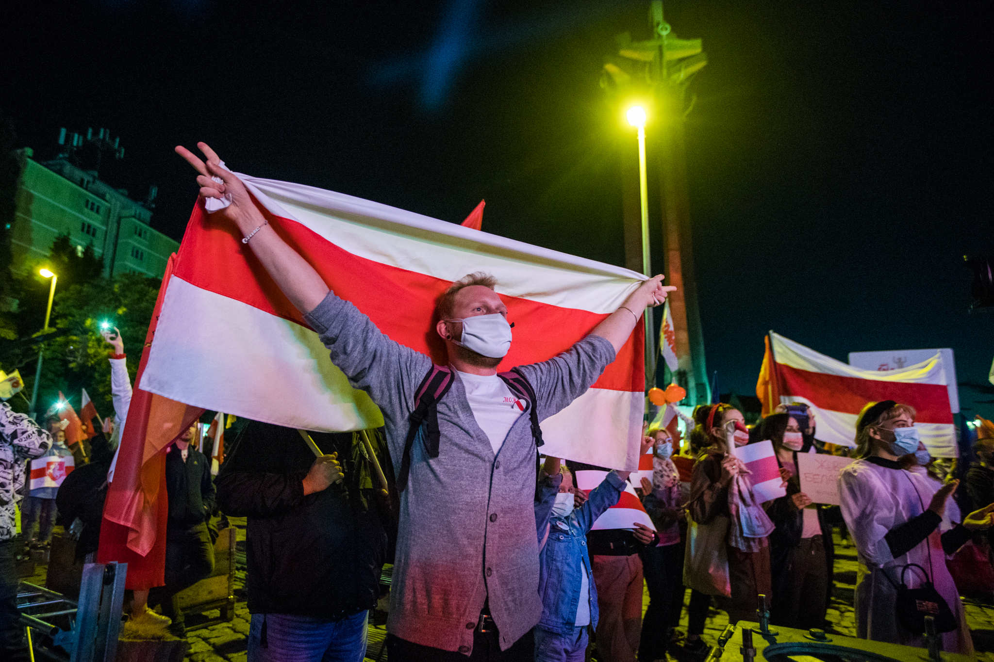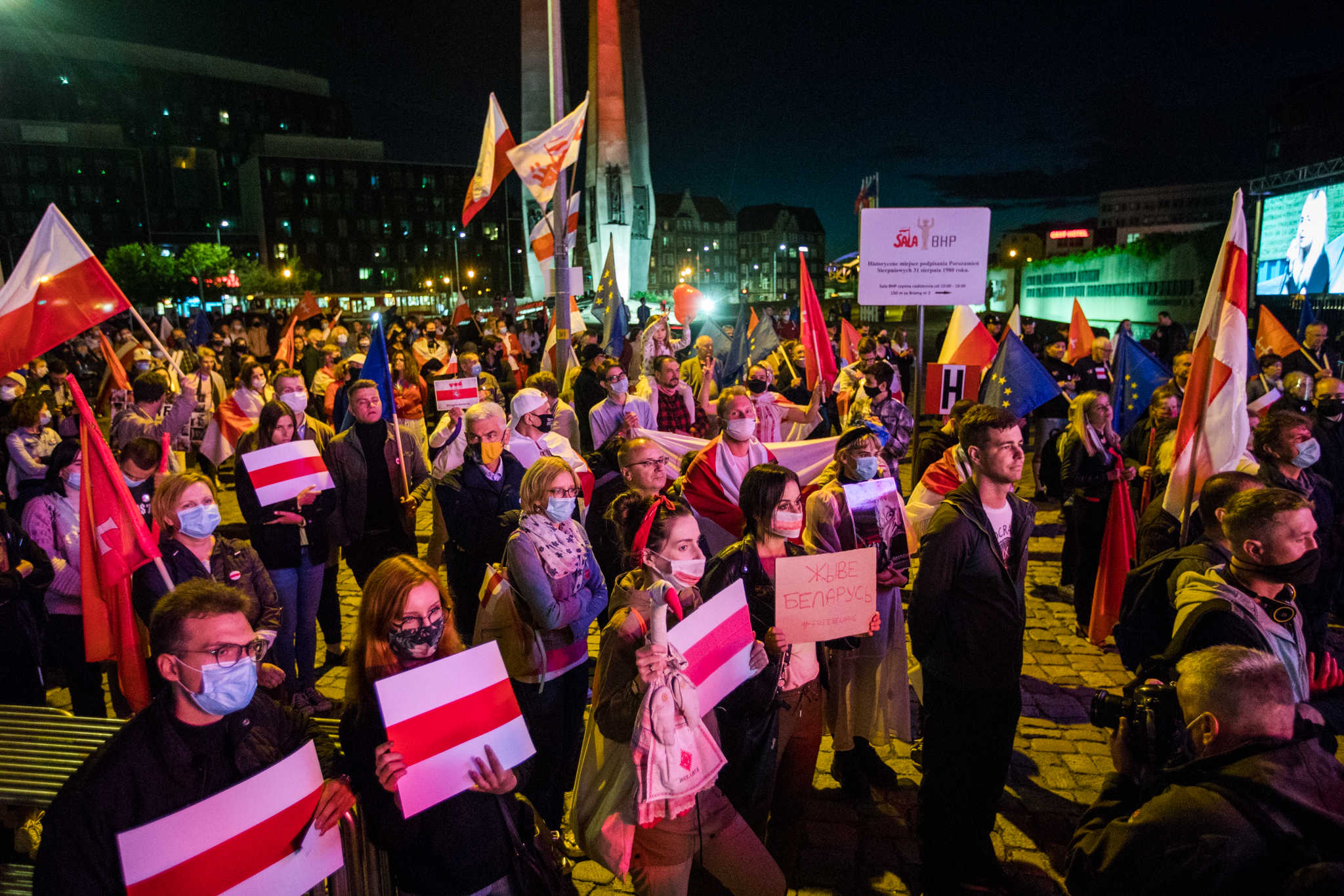 Spotkanie na placu Solidarności symbolicznie zakończyło obchody 40. Rocznicy Porozumień Sierpniowych. Pod historyczną bramą nr 2 Stoczni Gdańskiej zebrali się mieszkańcy Pomorza. Wśród nich było wielu Białorusinów mieszkających i pracujących w naszym regionie. W tłumie powiewały, biało-czerwono-białe białoruskie flagi, które zostały zdelegalizowane przez rząd Alaksandra Łukaszenki i które stały się symbolem białoruskich protestów. W takich samych barwach została podświetlona brama stoczni.