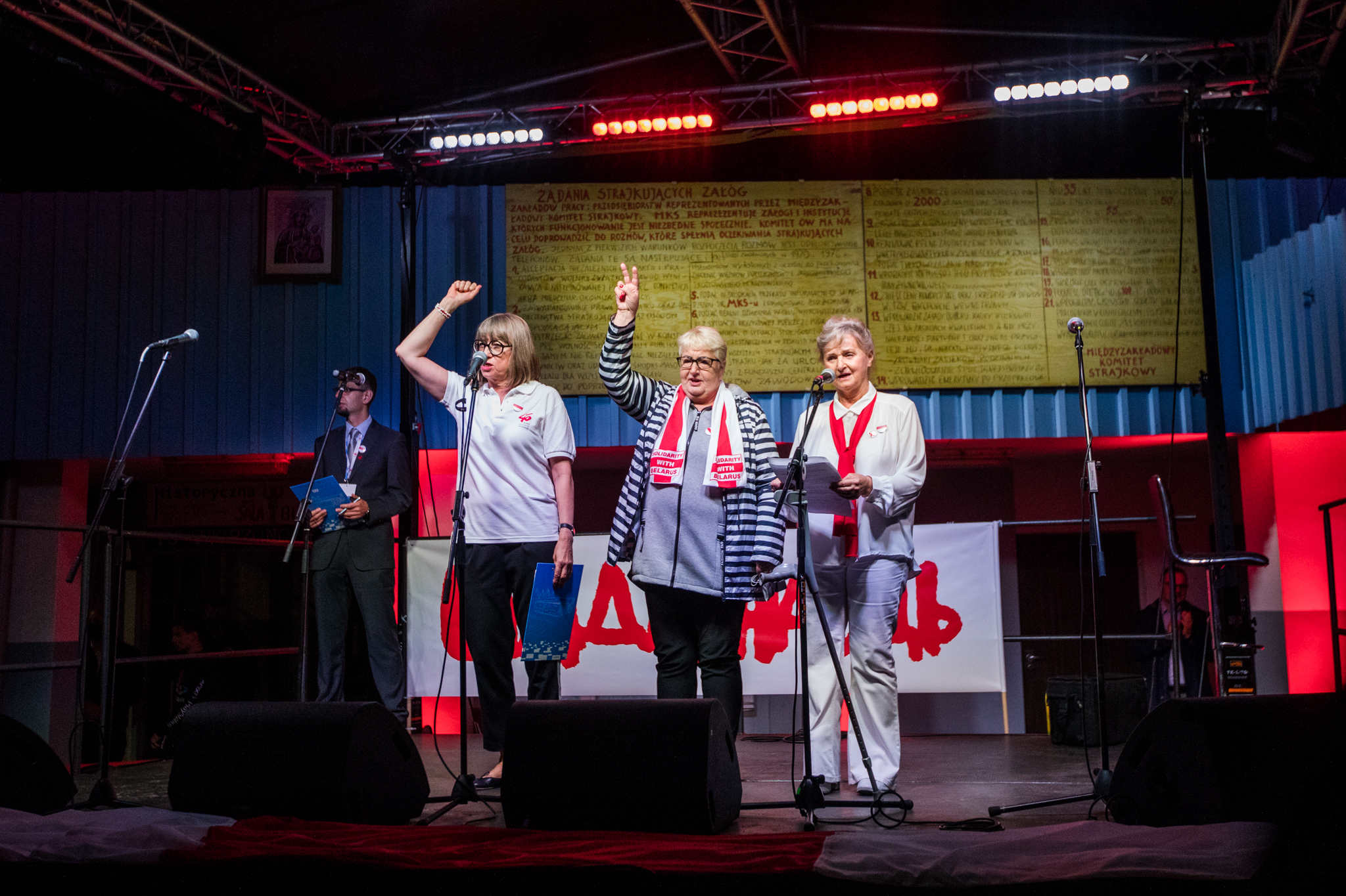 Za pośrednictwem telebimu do wiecujących przemówiła Swiatłana Cichanouska, kontrkandydatka Alaksandra Łukaszenki w niedawnych wyborach prezydenckich. – Dziś w mojej ojczystej Białorusi ludzie wyszli protestować przeciwko niesprawiedliwości i w obronie swoich praw. Ruch Solidarności do dziś inspiruje ludzi walczących o swoje prawa na całym świecie. Także nas, Białorusinów – mówiła. Z ekranu przemawiał do wiecujących także Donald Tusk, przewodniczący Europejskiej Partii Ludowej. – Wedy czterdzieści lat temu świętowaliśmy podpisanie porozumień, czuliśmy wsparcie wolnych ludzi z całego świata. Ta międzynarodowa solidarność była źródłem naszej siły i nadziei, że dobro może zatriumfować nad złem. Dziś świat podziwia naszych braci Białorusinów, którzy z podobną determinacją walczą o swoją wolność, godność i podstawowe prawa człowieka. Nie ma, bowiem bezpiecznej Polski bez wolnej Białorusi i nie ma sprawiedliwej Europy bez Białorusi suwerennej – mówił Tusk.