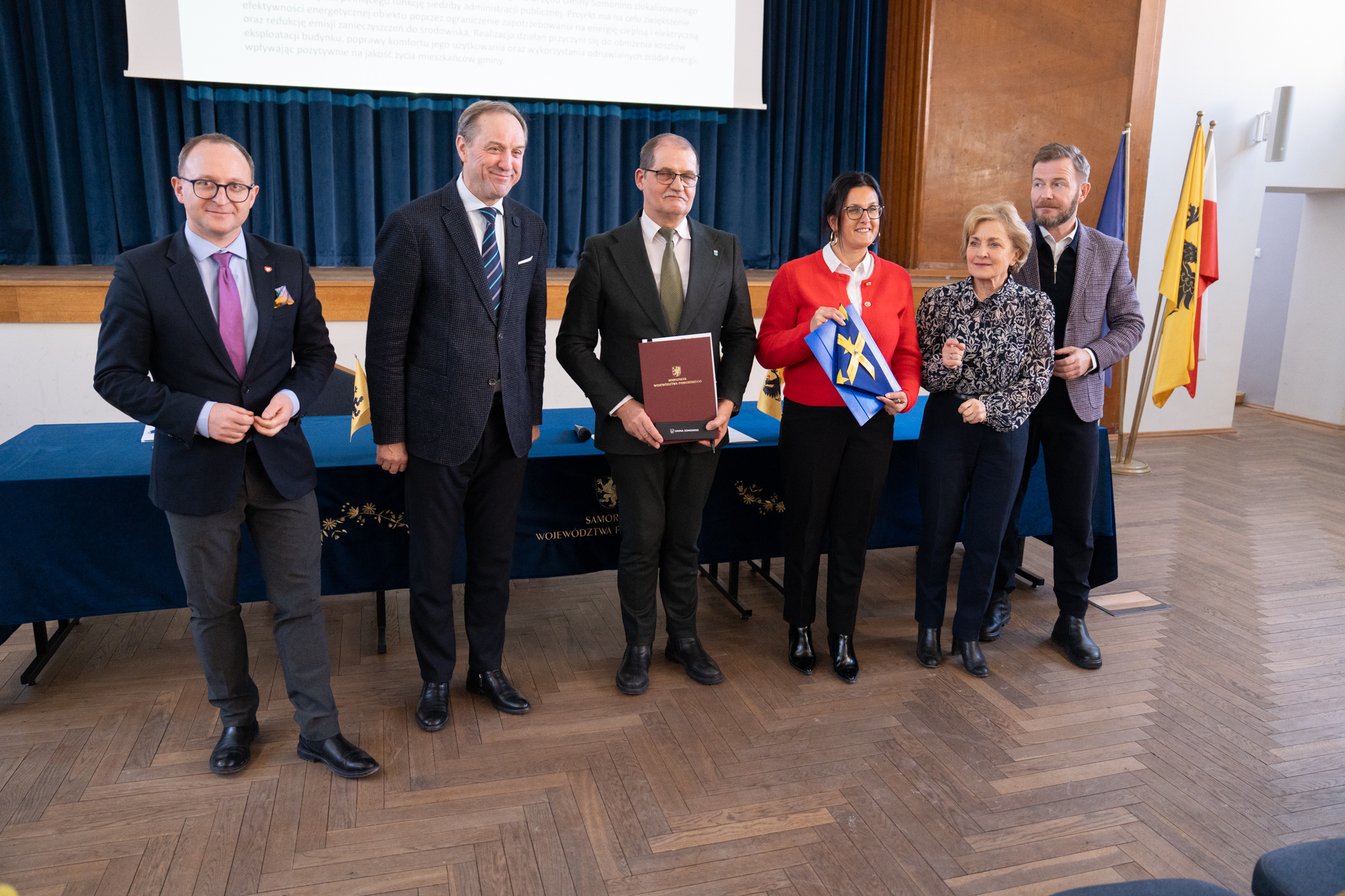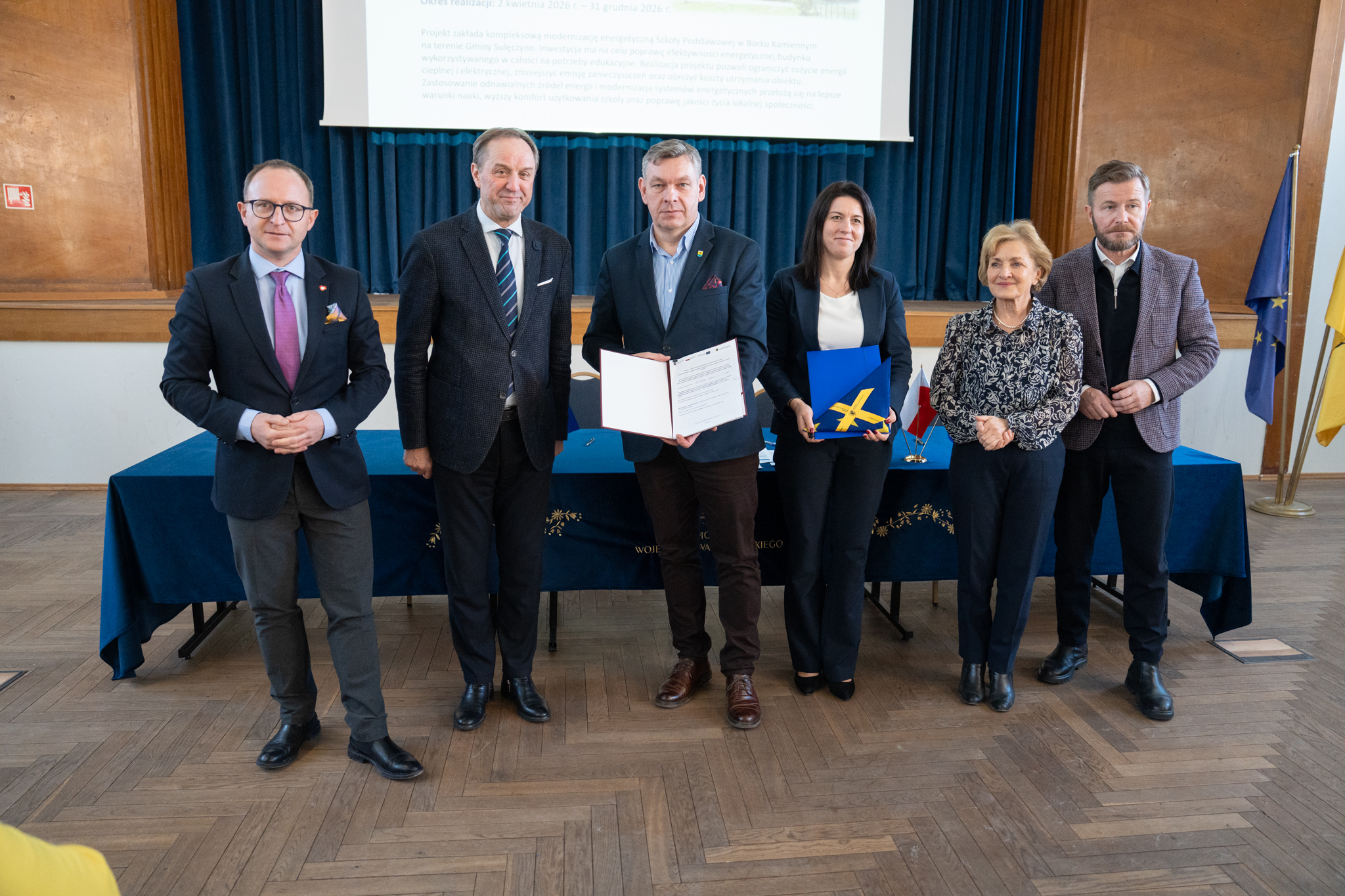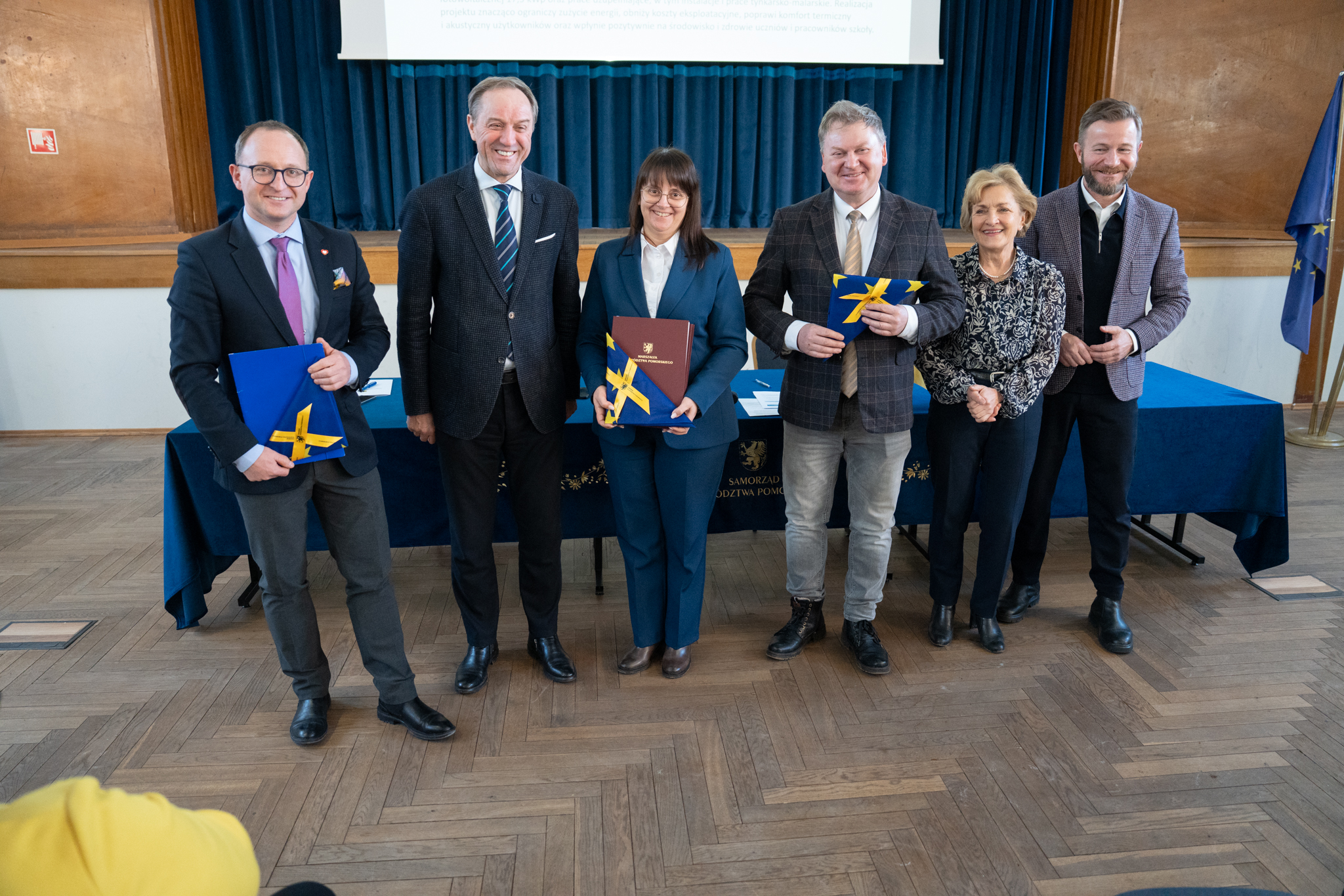 Marszałkowie województwa pomorskiego Mieczysław Struk i Marcin Skwierawski podpisali 2 kutego 2026 r. z przedstawicielami samorządów umowy na dofinansowanie projektów termomodernizacji budynków użyteczności publicznej.