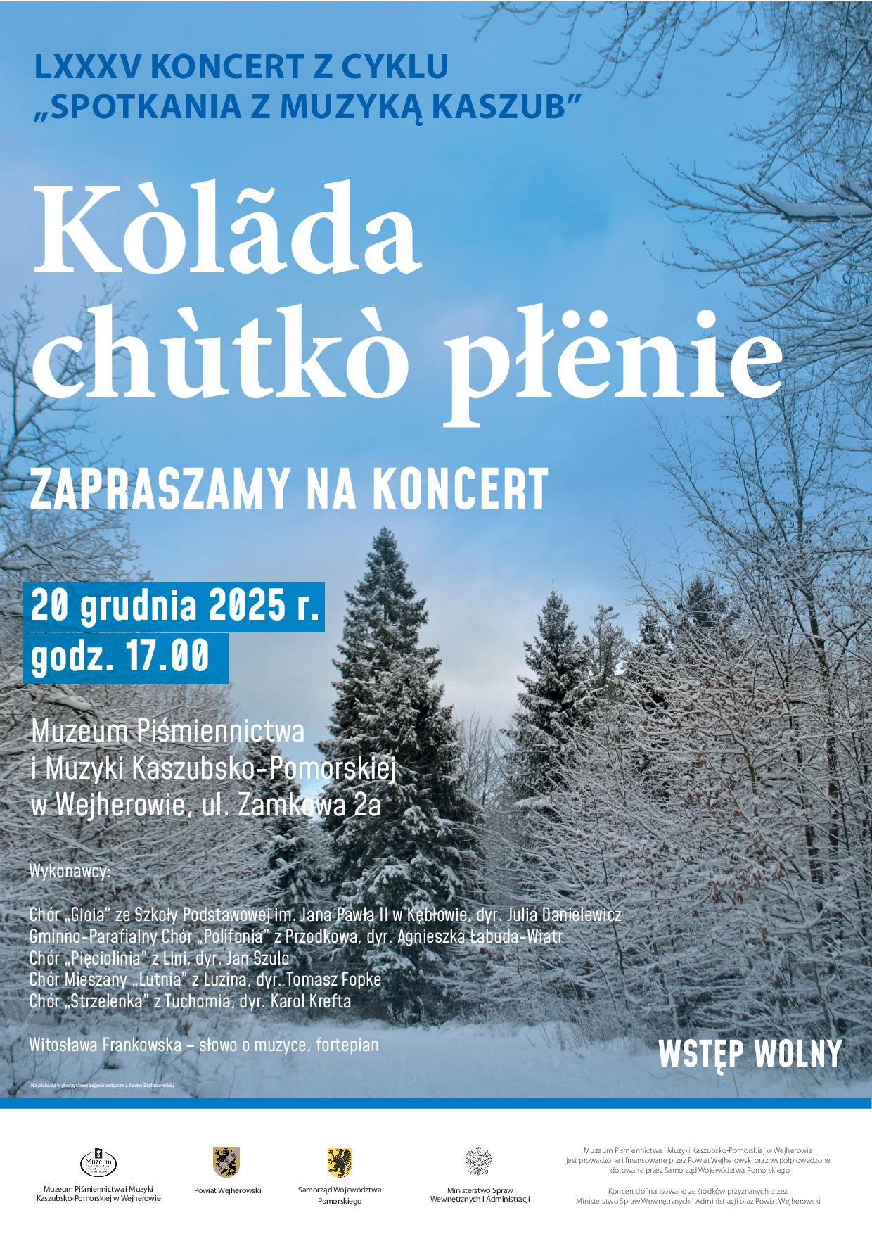 Muzeum Piśmiennictwa i Muzyki Kaszubsko-Pomorskiej w Wejherowie zaprasza na ostatnie w tym roku wydarzenie z cyklu Spotkania z muzyką Kaszub. Koncert „Kòlãda chùtkò płënie” odbędzie się w sobotę, 20 grudnia 2025 r. Wstęp – wolny.