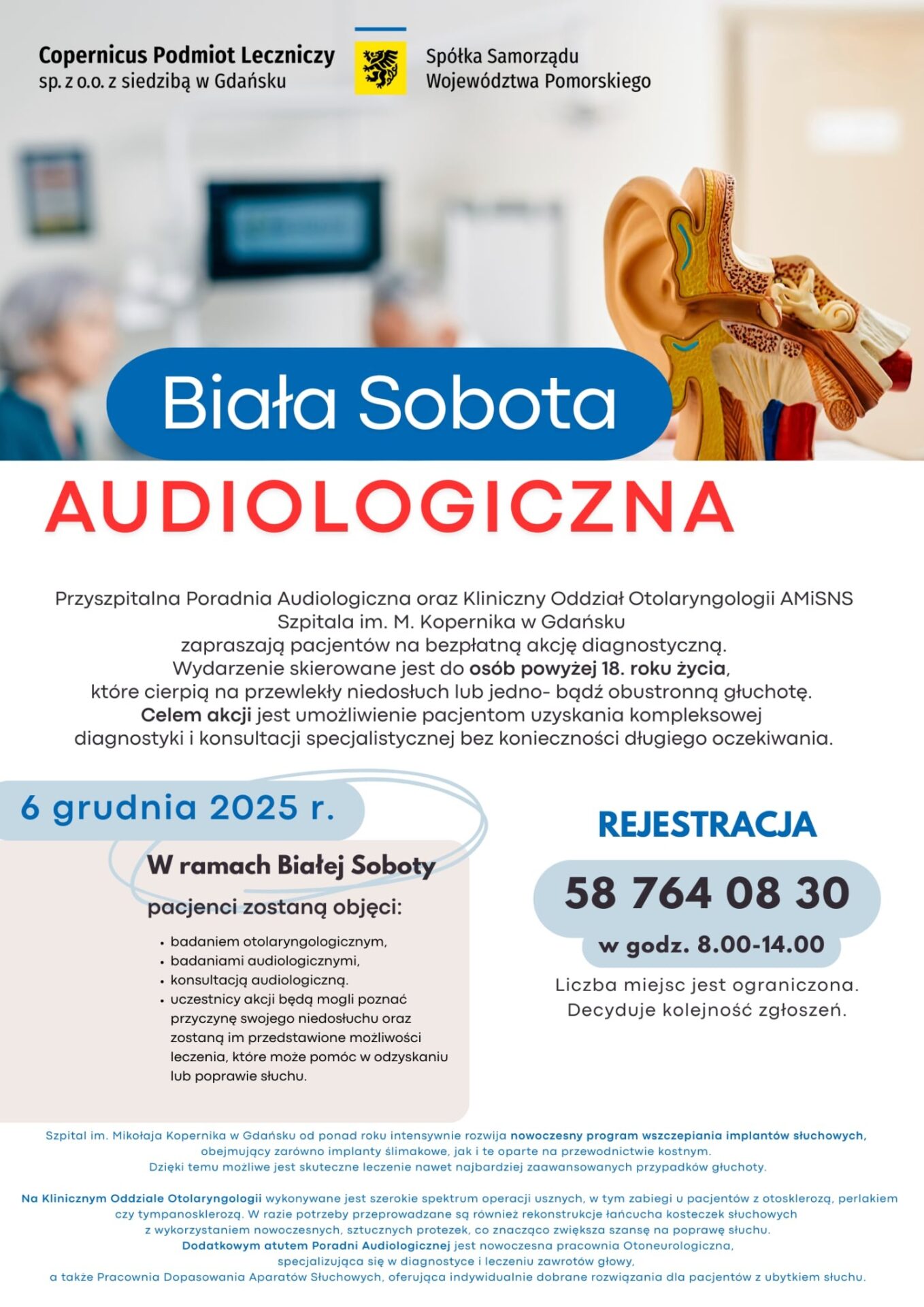 Na bezpłatną akcję diagnostyczną pod nazwą Biała sobota audiologiczna zapraszają przyszpitalna Poradni audiologicznej oraz Kliniczny Oddział Otolaryngologii Akademii Medycznych i Nauk Społecznych Szpitala im. M. Kopernika w Gdańsku. Badania będą wykonywane przy ul. Powstańców Warszawskich 1/2 w Gdańsku (budynek byłego Szpitala Kolejowego). Rejestracja telefoniczna pod numerem: 58 764 08 30, w godz. 8.00-14.00. Liczba miejsc ograniczona – decyduje kolejność zgłoszeń!