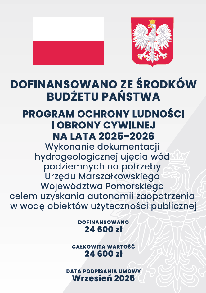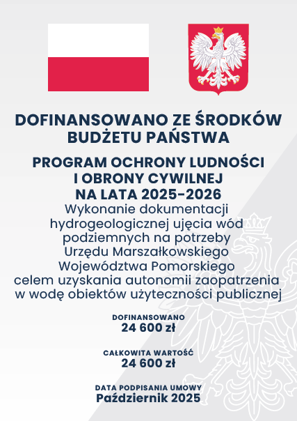 Wykonanie dokumentacji hydrogeologicznej ujęcia wód podziemnych na potrzeby Urzędu Marszałkowskiego Województwa Pomorskiego celem uzyskania autonomii zaopatrzenia w wodę obiektów użyteczności publicznej w ramach Programu Ochrony Ludności i Obrony Cywilnej na lata 2025-2026