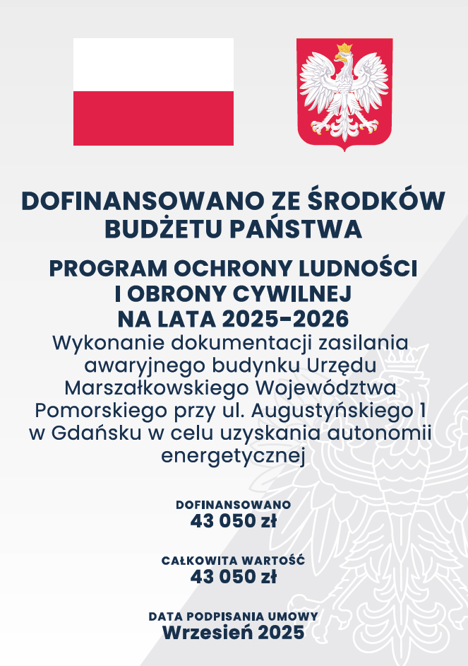 Województwo Pomorskie uzyskało dotację celową z budżetu państwa na wykonanie dokumentacji zasilania awaryjnego budynku Urzędu Marszałkowskiego Województwa Pomorskiego przy ul. Augustyńskiego 1 w Gdańsku w celu uzyskania autonomii energetycznej w ramach Programu Ochrony Ludności i Obrony Cywilnej na lata 2025-2026.