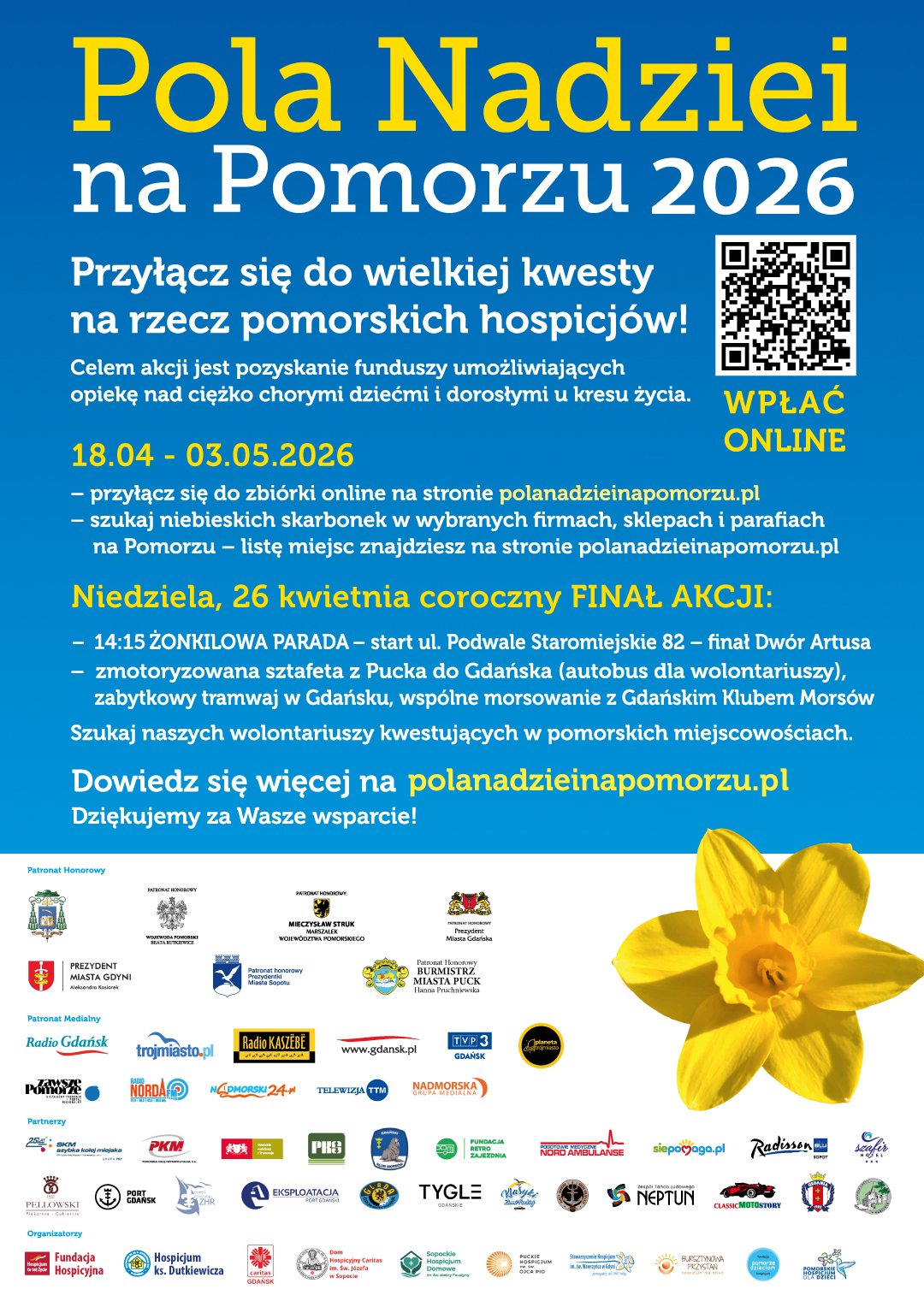 Tysiące żonkili, barwna parada i prawie cztery tysiące wolontariuszy na ulicach pomorskich miast i miasteczek. Wielki finał Pól Nadziei już w niedzielę, 26 kwietnia 2026 r. Wolontariusze będą wręczać żonkile i zbierać datki na rzecz dzieci i dorosłych – podopiecznych siedmiu hospicjów z naszego regionu. Jak co roku wyjątkowa parada wyruszy z Pucka do Gdańska.